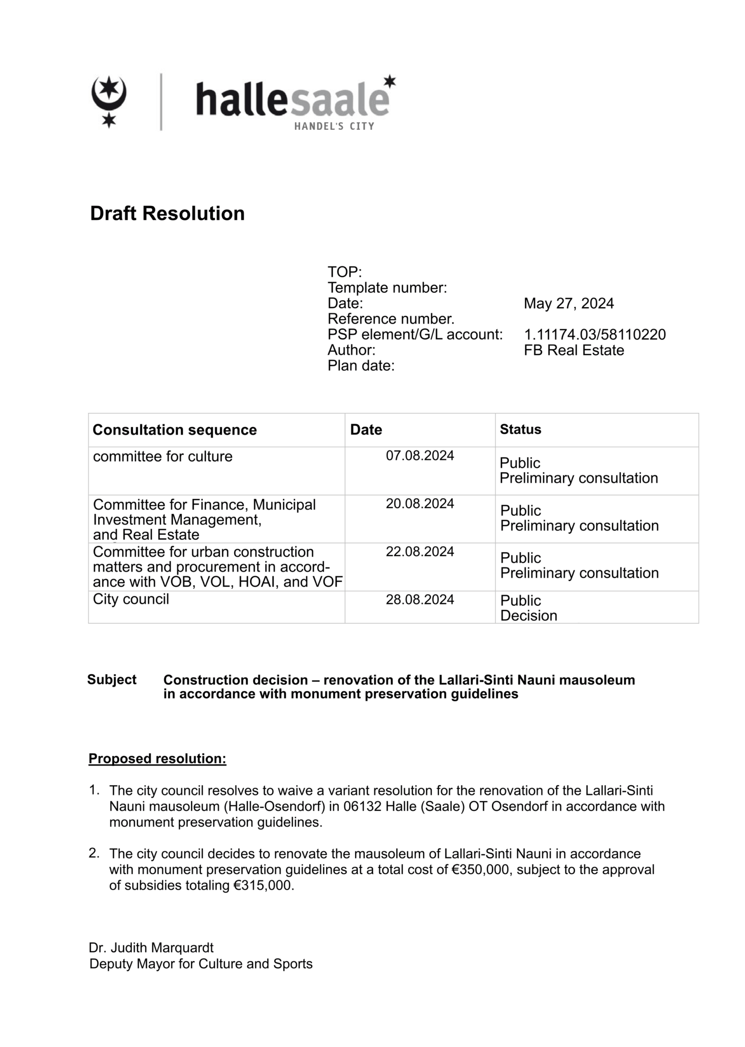 On August 28, 2024, the Halle City Council approved the draft resolution for the renovation of the Osendorf Mausoleum in accordance with monument preservation guidelines by a large majority.